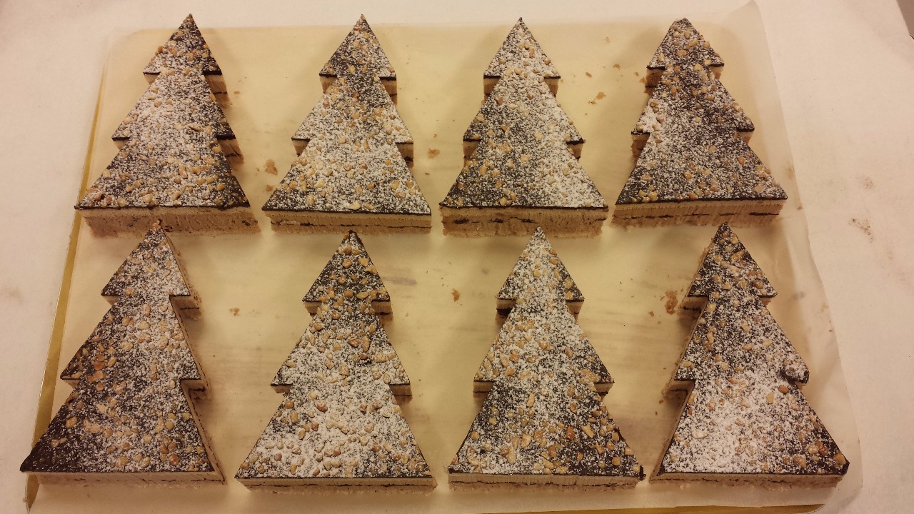 Pastas artesanas Opillas con bizcocho de almendra Pinos navideños de praliné